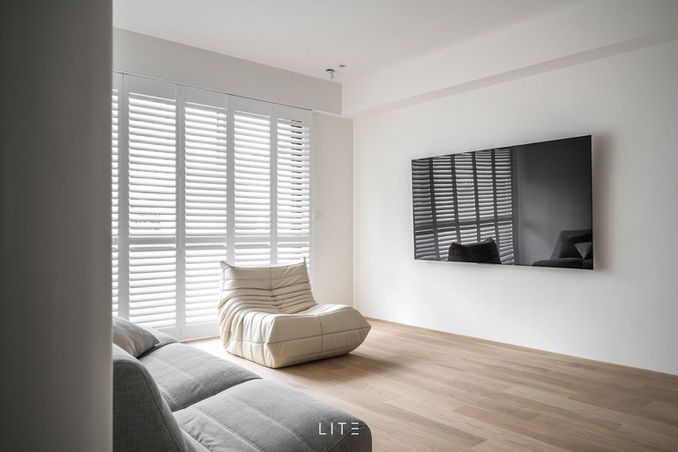 公領域(玄關/客廳):百葉窗引光入室,光影遊走於 白牆與木地間,保留空間呼吸感。