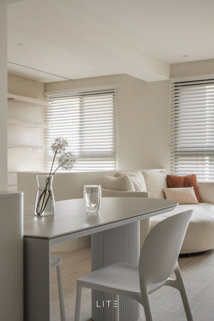 客餐廳:奶茶灰調、圓弧收邊、小巧家具,塑造溫潤及親膚的日常語言。